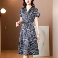 密瓜森林 印花連衣裙女中長款2019夏裝新款韓版修身顯瘦系帶短袖過膝長裙子 藏青色 XXXXL